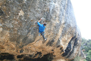 CLimbing here in margalef is intersting all the rock is a conglomerate of hardened sandstone mud with loads of pebbles in it, the pebbles then fall out leaving loads of pockets that form the holds. the river has then carved the walls of the valley to produce loads of huge overhangs and caves perfect for climbing,